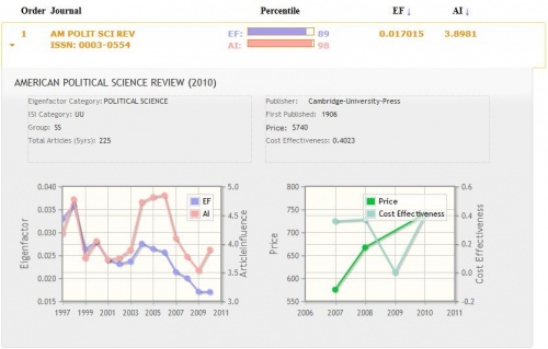 Další zajímavé indikátory, které udávají kvalitu vědeckých časopisů, lze ve zcela bezplatném režimu získat díky projektu Eigenfactor. Tato iniciativa je sponzorována Bergstromovou laboratoří působící na University of Washington a nemohla by účinně fungovat také bez dalších významných partnerů. Těmi jsou společnost Thomson Reuters, která poskytuje veškerá data ze své databáze Journal Citation Reports a také portálu Journalprices.com (http://www.journalprices.com/), jež udává ceny jednotlivých časopisů a umožňuje jejich pozdější komparaci. Eigenfactor pohlíží na odbornou literaturu jako na komplexní síť dokumentů, které jsou navzájem provázány citacemi. Důležitost časopisů je pak hodnocena pomocí pokročilých metod z teorie sítí. Zjednodušeně řečeno jsou za vlivné považovány ty časopisy, které jsou často citovány ostatními vlivnými časopisy [VAVŘÍKOVÁ, 2008]. Pro vědecké seriály jsou vyčíslovány dva indikátory:
